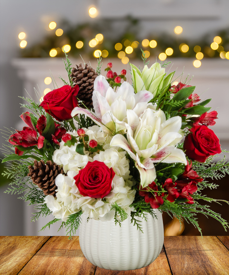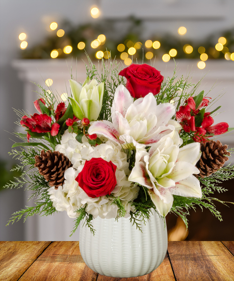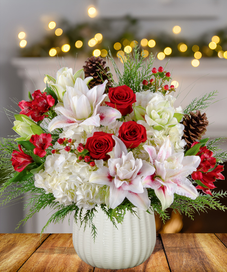 Add a cheerful touch to your holiday celebrations with "Jolly Jingle Berry," a festive Christmas Collection arrangement by Billy Heroman’s in Baton Rouge. This delightful design features vibrant red roses, soft light pink rose lilies, lush hydrangeas, delicate alstroemeria, festive red hypericum berries, and rustic pinecones. Perfect as a centerpiece or seasonal décor, this arrangement brings a harmonious blend of elegance and holiday charm.