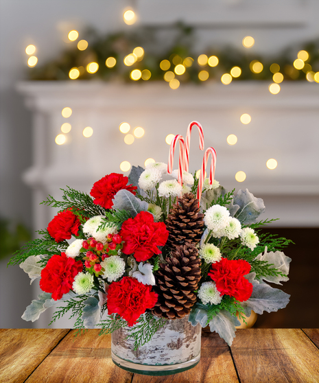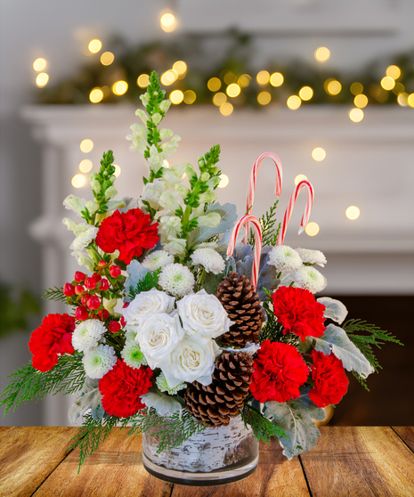 Spread holiday cheer with "Peppermint Bark" from Billy Heroman’s Christmas Collection. This festive arrangement combines vibrant red carnations, playful candy canes, and crisp white button mums, capturing the essence of Christmas. With charming seasonal accents, "Peppermint Bark" is perfect for brightening up your home or gifting to loved ones, adding a dash of holiday magic to any space.