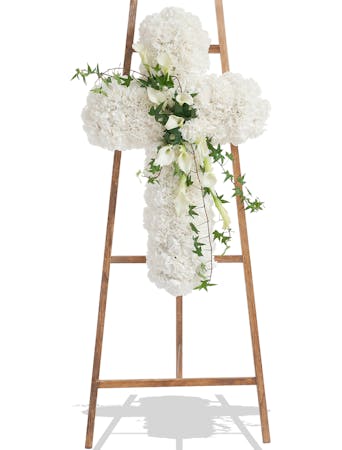 The Elegant White Cross Stand is a timeless symbol of faith and remembrance. This all-white floral tribute from Billy Heroman’s Elegant White Funeral Suite is expertly crafted in the shape of a cross, signifying peace, eternal life, and reverence.