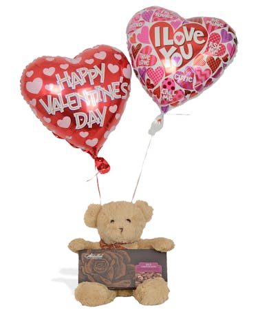 The perfect combination to excite your Valentine. Plush Bear, Fresh Chocolates and Valentines Balloons are included.